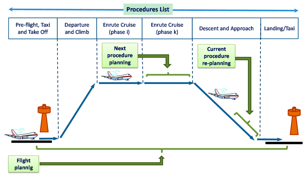 Then, in a sequence of gate-to-gate procedures (see Figure 3) the on-board planning activities in each phase are for planning the overall flight, planning the next flight phase (for updating trajectory data) or re-planning the current flight phase (when contingences arise).