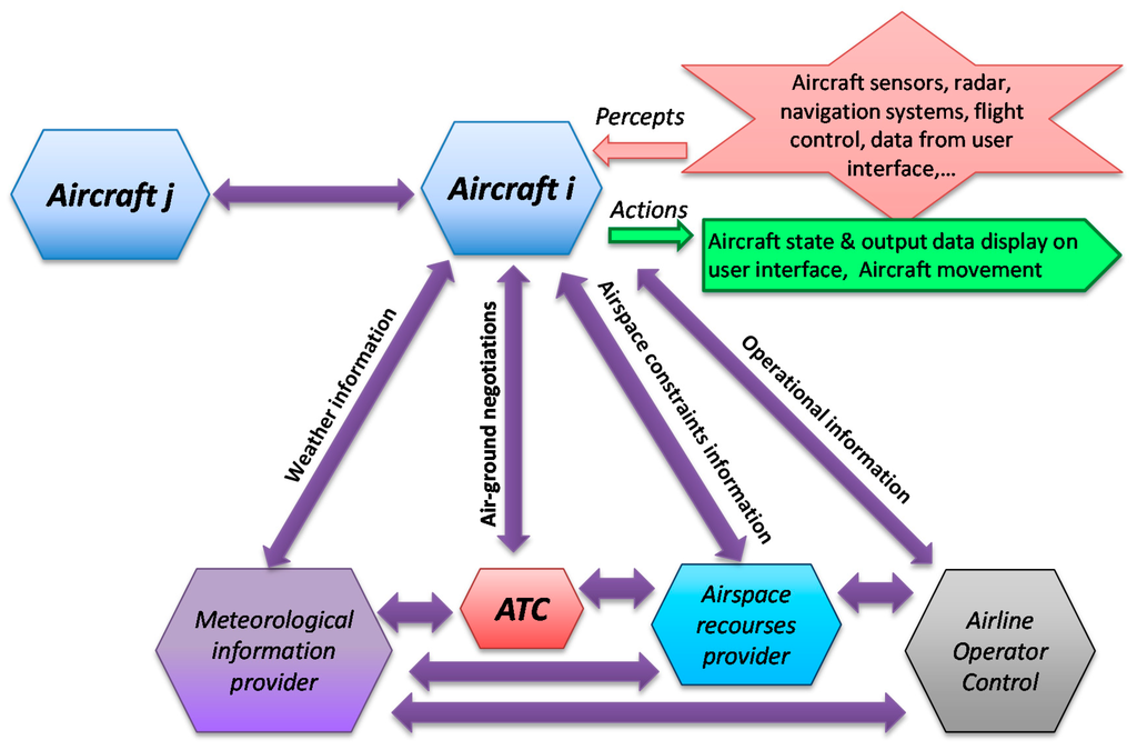 - New coordination procedures for distributed decision-making processes in order to make aircraft preferred trajectories compatible with a well-organized air traffic [10,11,12,13]. It requires the definition of new roles of the Smart Air Traffic System (SATS) agents and specific communication protocols for automated processes such as: (i) air-ground and air-air trajectories negotiation; (ii) managing shared information from aircraft and air traffic service providers; (iii) monitoring aircraft states and intentions from airborne (or navigation) and from ground (or air traffic control) perspectives; and (iv) solving unexpected events during the procedure execution.
