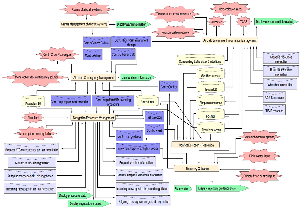 The Environmental Information Management System (EIMS) is responsible for updating environmental aircraft information as well as providing information about significant changes on it. This information is used by the Conflict Detection and Resolution System (CDRS) to generate specific contingence events to be treated by Contingence Management System. In the same way, Alarms Management System (AMS) generates contingence events for CMS when aircraft system alarms arise. EIMS, CDRS and AMS can be modeled through their respective capabilities (i.e., Aircraft Environment Information Management, Conflict Detection-Resolution and Aircraft Systems Alarm Management).