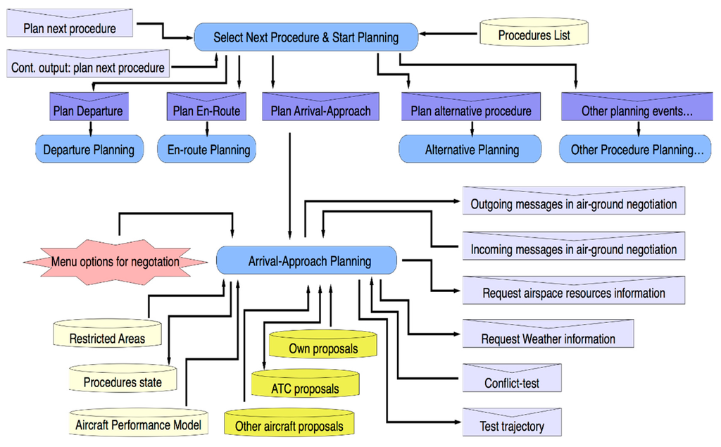 In order to illustrate aircraft agent inner processes when a planning procedure is being implemented, Figure 5 shows an example of basic air-ground negotiation protocol to negotiate arrival trajectories. Protocols like this one represent the core of a planning process for an arrival/approach procedure. This planning process for arrival and approach procedure (and therefore the mentioned protocol) is activated by a specific event occurring during the execution of previous en-route navigation procedures. Although a new negotiation scheme can be defined from this design, all of them will use similar functionalities to evaluate proposals and generate counter-proposals during their respective decision making-processes. Therefore, this protocol and its associated functionalities provide guidelines and enough specifications for developing new aircraft and ATC coordination procedures.