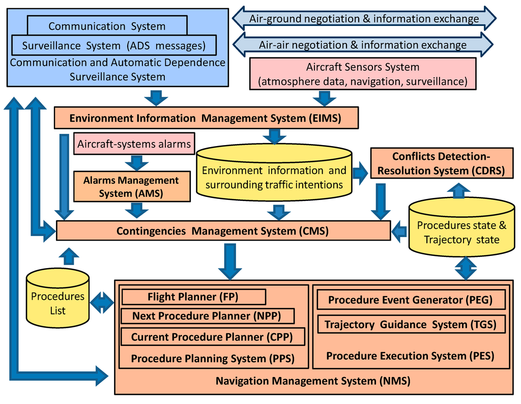 Besides, numerous experiments proved feasibility and beneficial to different HMI and support tools for decision-making for precision space separation in such environments [28,29,30]. Some examples of these tools for aircraft are: the Airborne Separation Assurance System (ASAS) [31], Cockpit Display Traffic Information (CDTI) [32,33] and Flight Management Systems (FMS) with four-dimensional (4D) trajectory guidance capabilities [34,35] (current FMS are able to track flight routes defined by tri-dimensional way-points -3D FMS- or way-points with Required Time of Arrival -3.5D FMS-). Moreover, some preliminary proposals for automated air-trajectory synchronization and negotiation have been evaluated [36,37]. Parallel to that, mathematical models and tools for trajectory predictions [18,38] and detections and resolution the conflicts where studied (e.g., [19,20,39,40]). Nevertheless new high-level functionalities for automatic coordination between aircraft systems and between these ones and other air traffic service providers are required. Other approaches have focused on simulation of air traffic scenarios with different levels of fidelity to develop and evaluate new operational concepts (e.g., [41,42,43,44]). Experimental results of these works indicate that advanced ATM concepts make a sound case for next generation air-traffic systems; however, there is a need to investigate and understand their complex interaction under non-nominal scenarios [42].
