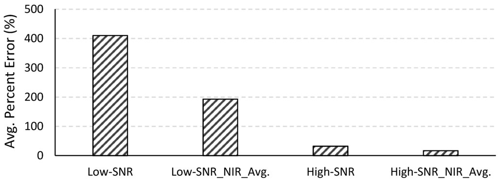 The two-band NIR-red algorithm is not computationally intensive and was therefore applied to all 490 images. Figure 10 shows the average percent errors of the estimated chl-a concentrations for the low- and high-SNR systems with and without spatial averaging at NIR wavelengths. The average percent error for the low-SNR system was very high (410.12%). Algorithms such as the two-band NIR-red algorithm that are empirically parameterized are very sensitive to the coefficients of the regression equation governing the algorithm. These algorithms are built on the assumption that variations in the reflectances at the wavelengths included in the algorithm are primarily, if not solely, due to variations in the water quality parameter of interest. As such, these algorithms are very sensitive to variations in the reflectances due to any other factor such as sensor noise. This is important to bear in mind when assessing the NIR-red algorithm because the effects of the sensor noise are expected to be higher in the longer wavelengths. The numerical method, on the other hand, considers the entire spectrum while retrieving water quality parameters (400–725 nm in our case) and can tend to average out the noise across the spectrum without being overly sensitive to noise in one or two particular wavelengths. The absolute error yielded by a semi-analytical algorithm can be mitigated by adjusting the coefficients of the regression equation. The emphasis here is, therefore, not on the absolute error in the chl-a concentrations retrieved from the NIR-red algorithm but on the improvement achieved by spatially averaging the NIR reflectances and changing the F-number. When NIR reflectances from the low-SNR system were spatially averaged, the percent error in the retrieved chl-a concentration reduced to 192.89%. The percent error for the high-SNR system was 32.06% without NIR spatial averaging and 16.86% with spatial averaging at the NIR spectral bands. In summary, the error in the retrieved chl-a concentration reduced by 92.18% when the F-number was changed from 3.5 to 1.0. For both systems, spatial averaging in the NIR wavelengths resulted in approximately 50% reduction in error in the retrieved chl-a concentration.