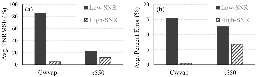 Average (a) PNRMSE and (b) percent error of Cwvap and τ550 retrieved from all 490 images for the low- and high-SNR systems.