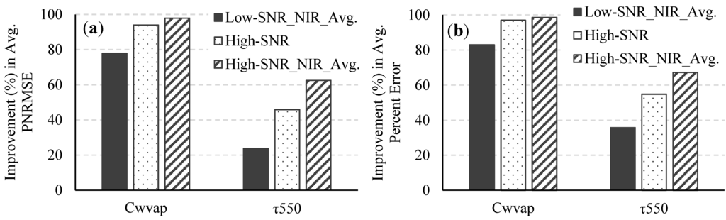 Improvements in (a) the average PNRMSE and (b) the average percent error of the retrieved Cwvap and τ550 for the low-SNR system with spatial averaging in the NIR spectral bands, the high-SNR system, and the high-SNR system with spatial averaging in the NIR spectral bands over what was obtained for the low-SNR system.