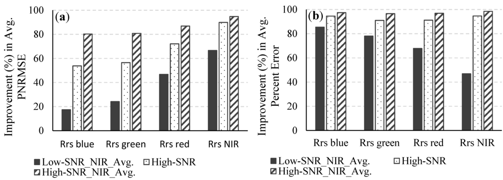Improvements in (a) the average PNRMSE and (b) the average percent error of the retrieved Rrs for the low-SNR system with spatial averaging in the NIR spectral bands, the high-SNR system, and the high-SNR system with spatial averaging in the NIR spectral bands over what was obtained for the low-SNR system.