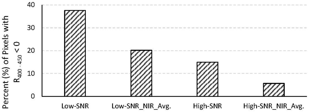 Erroneous retrievals of atmospheric parameters during atmospheric correction, especially overestimation of the contribution from atmospheric aerosols to the TOA radiance, can cause over-correction of the at-sensor radiance, resulting in negative reflectances, particularly in the blue region. This is a critical problem, especially in coastal waters near land-water transition zones where there is significant variability in atmospheric aerosols. Overestimation of aerosol contribution can be due to violation of the dark-pixel assumption at the wavelengths used for aerosol retrieval (e.g., []) and/or noise in the spectral channels at those wavelengths. In our study, the SPM concentrations were kept very small and the original at-surface reflectances were made to be zero at the NIR spectral bands used for aerosol retrieval. Therefore, errors in the aerosol retrieval can be attributed fully to sensor noise. Negative reflectances in the blue region render the retrieved water quality parameters invalid or highly questionable (depending on the algorithm used for retrieving the water quality parameters). Figure 8 shows the average (from the 490 images) percentage of pixels with negative reflectances in the entire 400–450 nm region for data from the low-SNR and high-SNR systems with and without spatial averaging at the NIR spectral bands. The high-SNR system produces significantly fewer pixels with negative reflectances in the blue region.