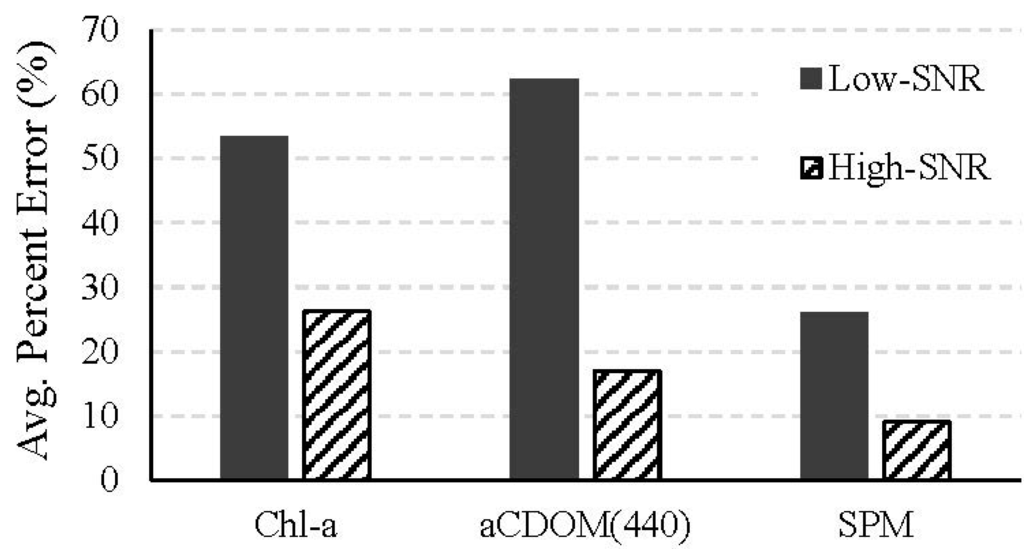 The average percent errors for the low- and high-SNR systems in the concentrations of chl-a and SPM and aCDOM(440) retrieved from the 20 atmospherically corrected noisy images using the non-linear least squares error minimization approach