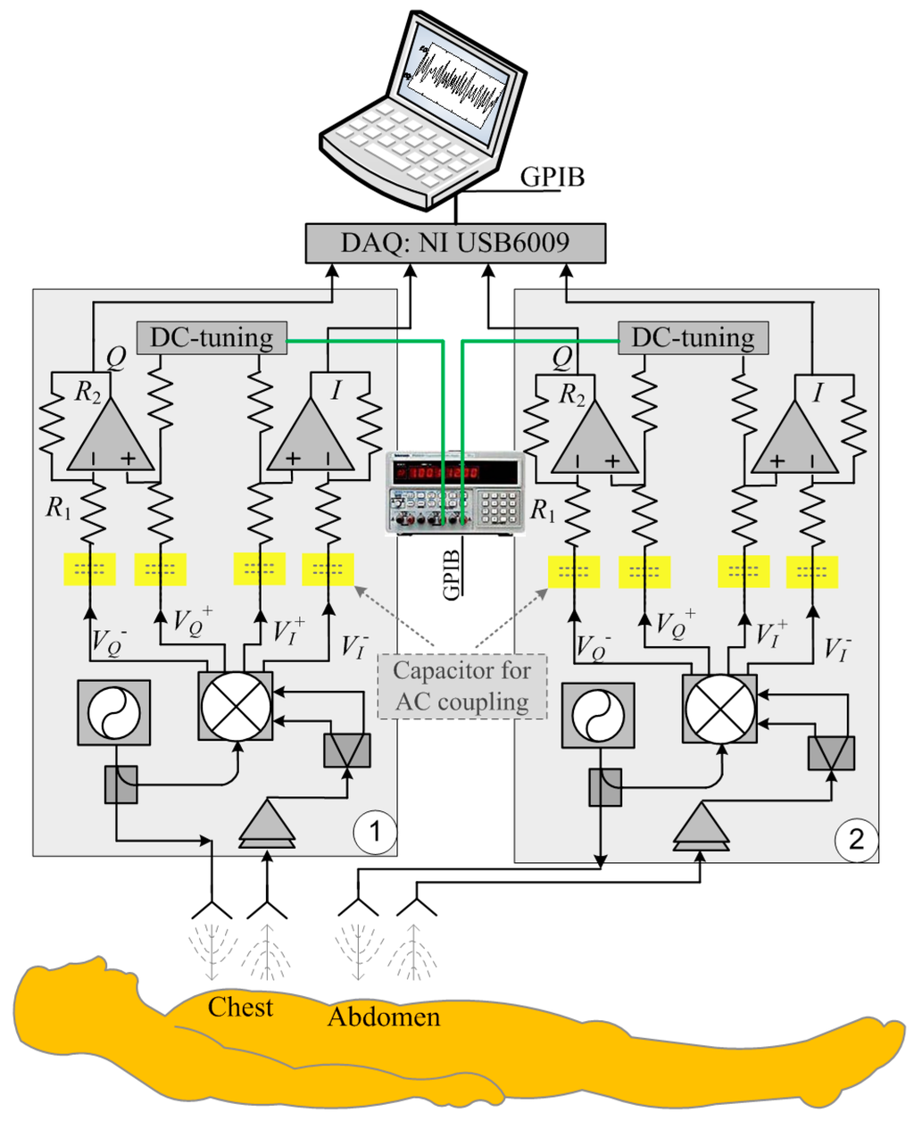 Block diagram of the DC coupled multi-radar system for respiration assessment at chest and abdomen.