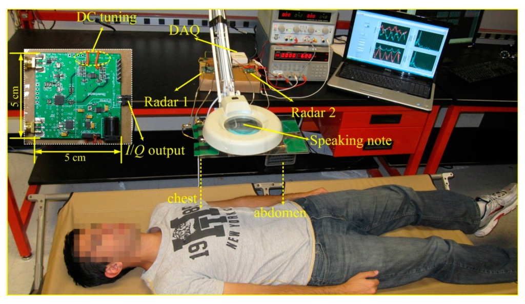 Figure 3. The two radar sensors were placed on the table, connecting the antennas via coaxial RF cables. The data acquisition card (NI USB6009) collected the radar-measured signals, which were processed and displayed in real time by a LabVIEW program running on a laptop. Two power supplies were used to provide four channels of DC voltage to adaptively tune the DC offset for the two radar sensors. It should be noted that the DC tuning process should be carried out for every subject and every experiment. The DC offset was caused by the reflections from the stationary part of the subject body and the stationary objects around the subject. Each subject person has a different physical characteristics and each experiment has different surrounding environment, which leads to different DC offsets. In the newly developed radar sensor system, the function of automatic DC offset tuning has been integrated in the microcontroller in the baseband circuitry. That way, the system would automatically tune the DC offsets to adapt to different subjects.