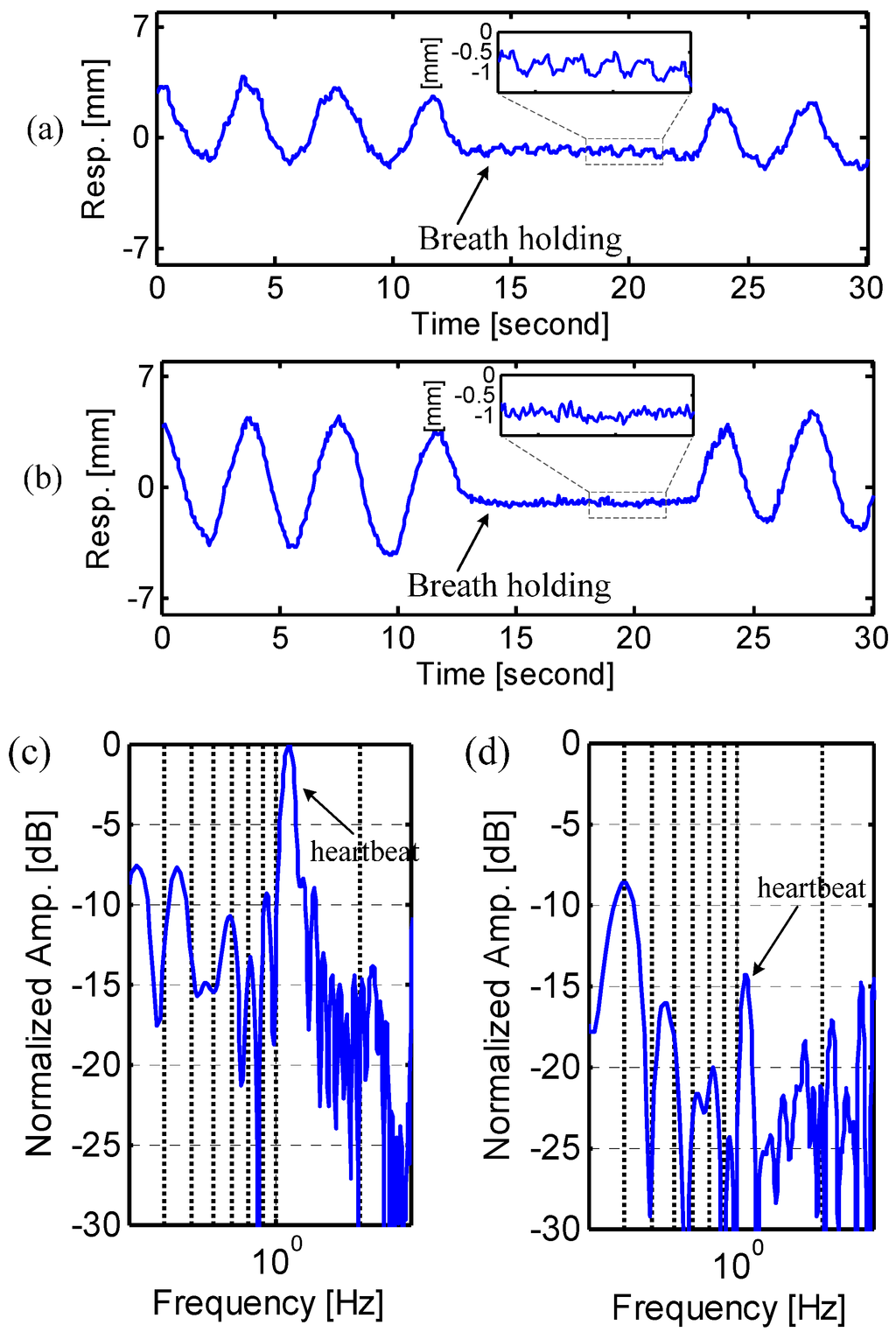 Figure 4a. First, the subjects breathed normally at his/her natural rhythm. Then the subject was asked to hold the breathing as long as possible. After breath holding, the subjects started to breathe naturally again. The breath holding experiment is helpful in assessment of the radar performance in monitoring obstructive sleep apnea syndrome [