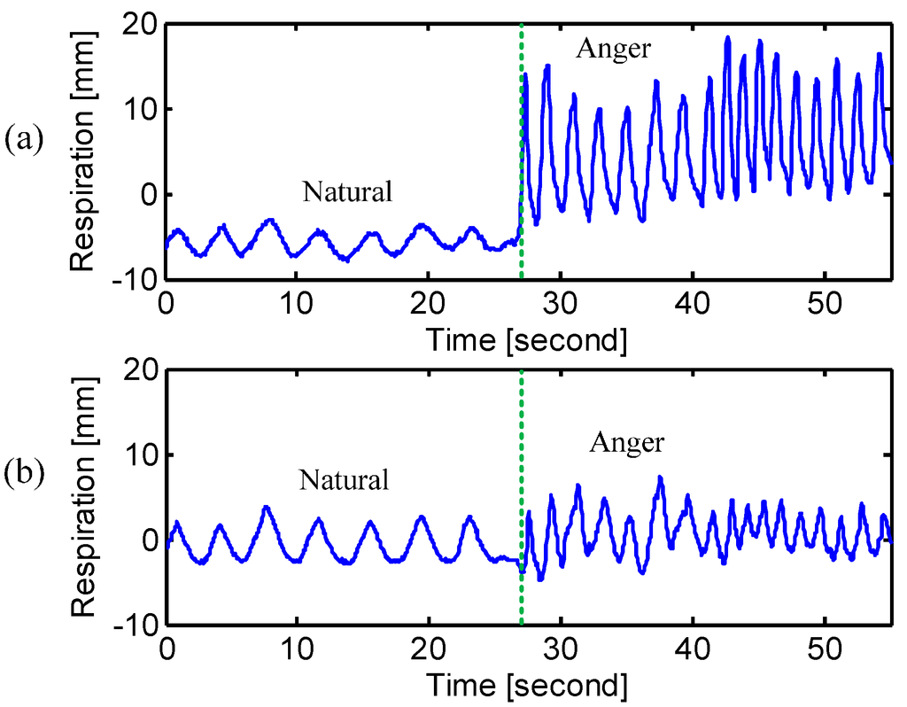 In the third experiment, the emotional breathing patterns of the subjects were measured. It has been proven that the breathing patterns change in response to the emotional states, such as anger, anxiety, tenderness, sadness,