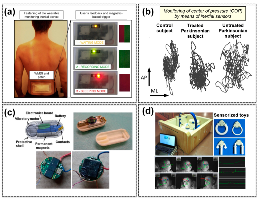 Examples of MEMS for medical applications. (a) Wearable monitoring inertial device for measuring sexual performance. Adapted with permission from [16] (copyright: Elsevier); (b) Center of pressure displacement maps obtained by means of tri-axial accelerometers mounted on healthy and Parkinsonian subjects. AP = antero-posterior plane, ML = medio-lateral plane. Adapted with permission from [24] (copyright: Creative Commons); (c) Endoscopic capsules provided with inertial sensors for vibratory motor control. Adapted with permission from [34] (copyright: Elsevier); (d) MEMS integrated in toys for monitoring preterm infants at risk of neurodevelopmental disorders. Adapted with permission from [38] (copyright: Creative Commons).