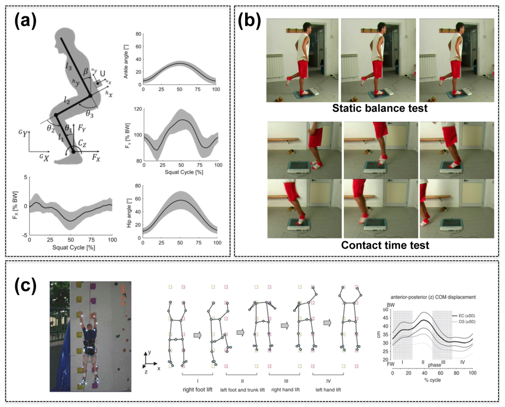 Examples of MEMS for sport and leisure applications. (a) IMU mounted on the trunk for estimating squat exercise dynamics. Adapted with permission from [91] (copyright: Elsevier); (b) MEMS pressure sensors used to assess balance abilities and non-cyclic rapidity of soccer players. Adapted with permission from [100] (copyright: Creative Commons); (c) Climbing dynamics quantified by means of kinematic data associated with vertical plantar reaction forces, measured through MEMS capacitive sensors. Adapted with permission from [104] (copyright: John Wiley & Sons).