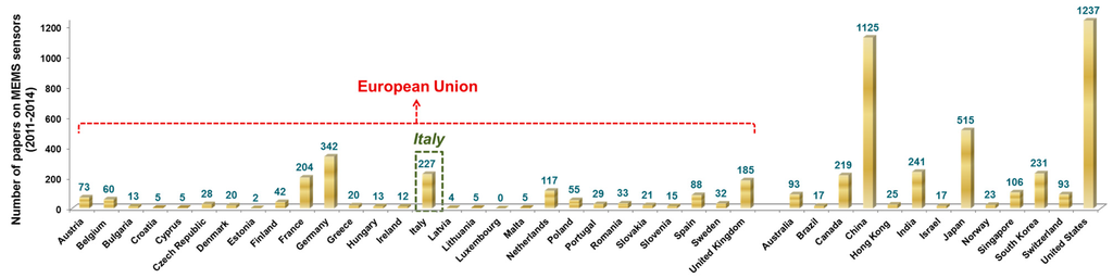 It is interesting to compare the recent research outputs that Italy produced on these topics with those emerged in other countries, worldwide. Figure 4 shows the number of research papers published on MEMS sensors, in the period 2011–2014, for all the countries that are members of the European Union (EU) and for other high-income and emerging countries.