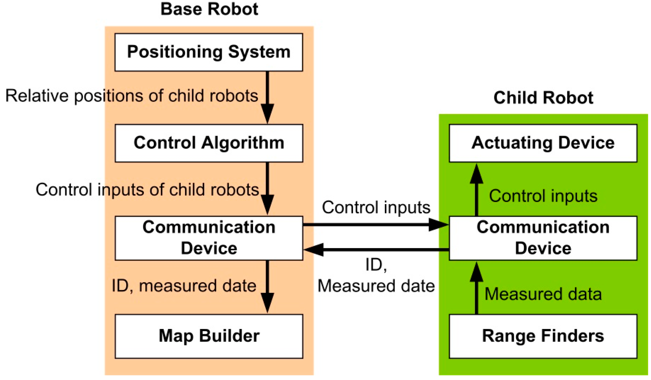 To maintain CESS, the base robot controls all child robots via a wireless communication device and the child robots provide obstacle information around the base robot. To detail the cooperation between the base and child robots, Figure 1 shows the CESS architecture.