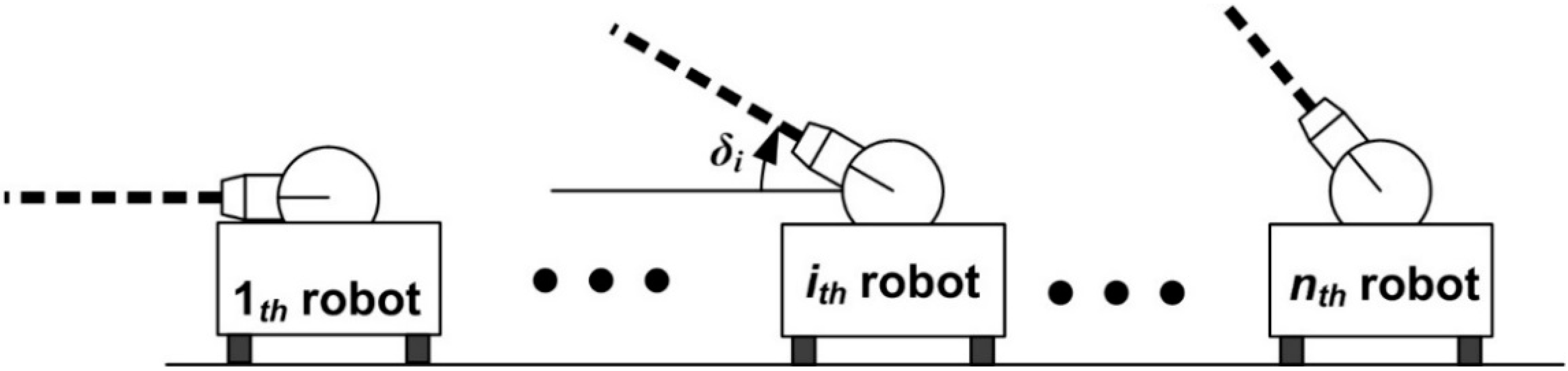 To allocate the child robots regularly, the angular positions between the adjacent child robots should be maintained as ψd = 2π/n. The control objective is that the errors chosen as: