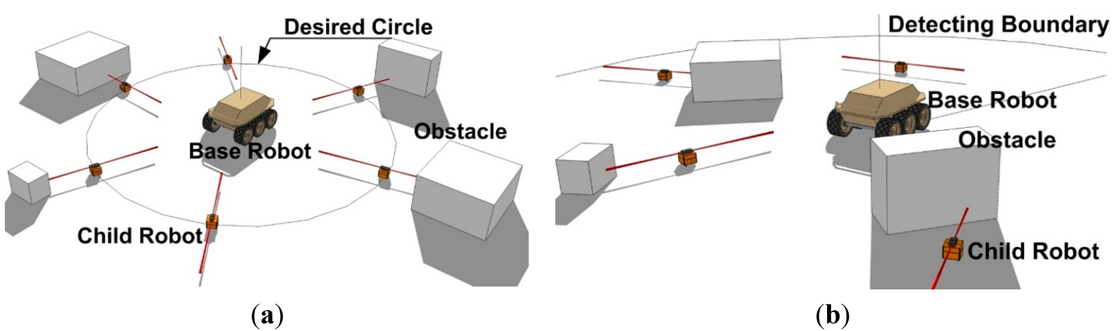 - Safe-wandering: The child robots wander around the base robot without collisions with adjacent child robots or obstacles.