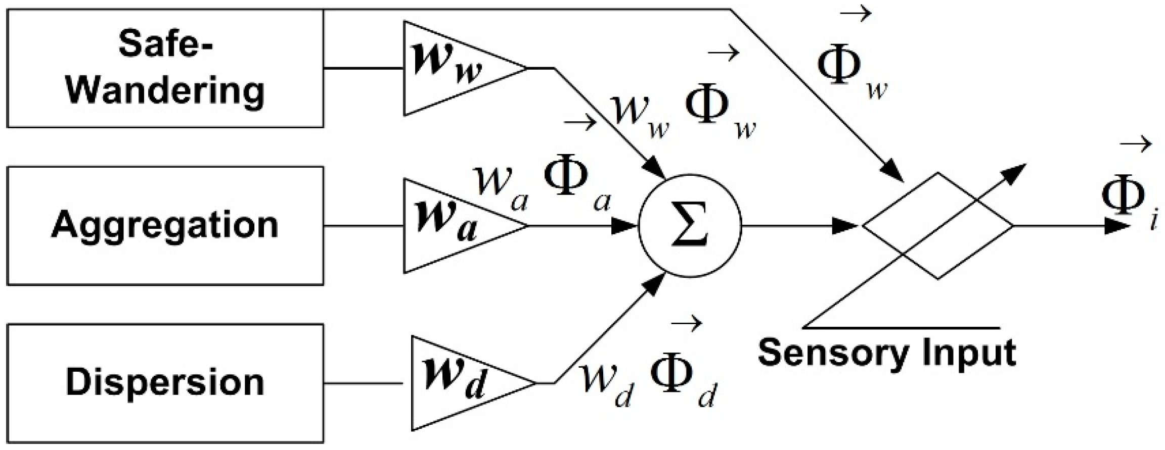is the normalized vector, w is the weighting factor, and i, a, d, and w mean the outputs of the ith robot, aggregation, dispersion, and safe-wandering, respectively. Accordingly, the desired orientation of the ith robot can be chosen as a direction of , as depicted in Figure 6.