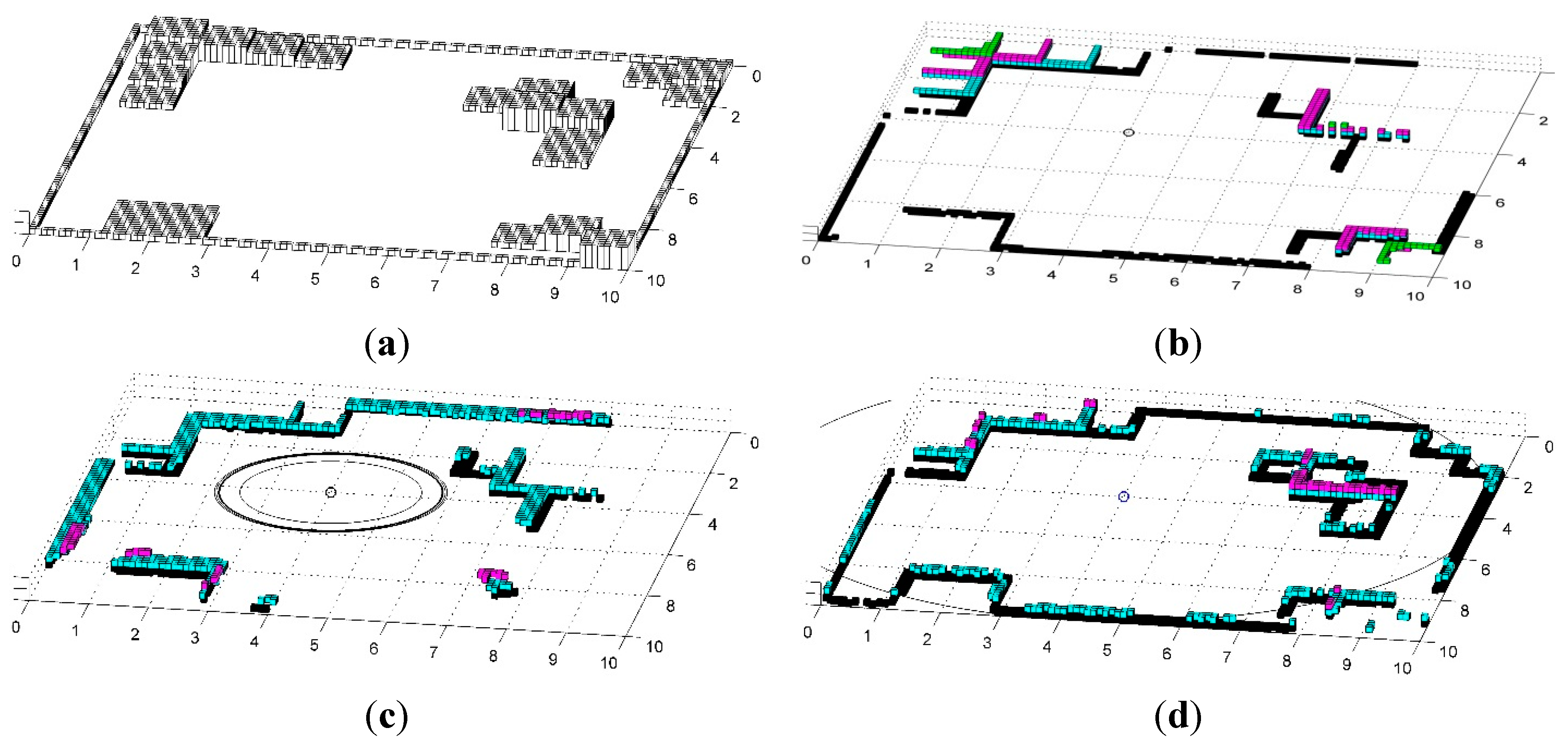 The performance of CESS in a 3D space. (a) The obstacle map; (b) The detected obstacles by LRF; (c) The detected obstacles by CESS, based on the vision-based positioning system; (d) The detected obstacles by CESS based on the UWB-based positioning system.