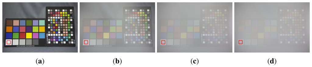 If there is a sufficiently large amount of fog or haze, the amount of scattering light is assumed to be uniform regardless of the wavelength. This assumption is proved by the simple experiment based on the theory of Narasimhan [11,12]. In order to observe the wavelength-dependent scattering, Figure 1 shows four images acquired from the same indoor scene with different turbidities generated by the different amount of steam using a humidifier.