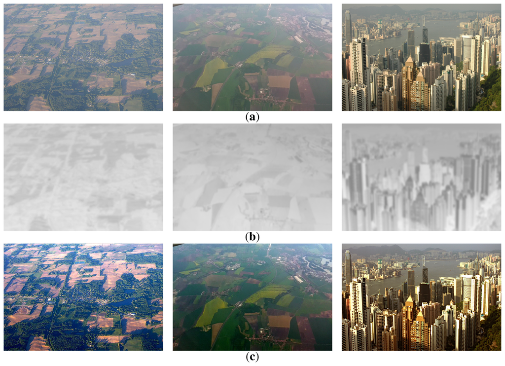 Figure 10a shows three hazy unmanned aerial vehicle (UAV) images; Figure 10b shows the modified transmission map using the proposed method; and Figure 10c shows the dehazed results using the proposed method. As shown in Figure 10c, the proposed dehazing method preserves fine details without color distortion. If there are no sky regions in an image, as shown in Figure 10, the atmospheric light can be simply estimated using the maximum intensity value.