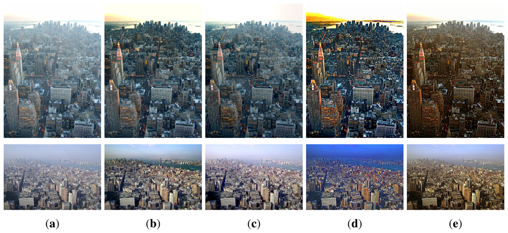 The performance of the proposed dehazing algorithm is compared with three existing dehazing methods. Figure 11a shows two hazy images, and Figure 11b shows the dehazed images using the conventional dark channel prior-based method [1], where the hazy components were removed at the cost of color distortion in the sky region. Figure 11c shows dehazed images using Fattal's method proposed in [15], where the haze is not completely removed in regions far from the camera. Figure 11d shows dehazed results using Tan's method proposed in [16], where color distortion is visible. As shown in Figure 10e, the dehazed image using the proposed method shows significantly improved image quality without color distortion or unnaturally amplified contrast. Furthermore, the proposed method maintains the haze in the sky and removes haze surrounding the buildings.
