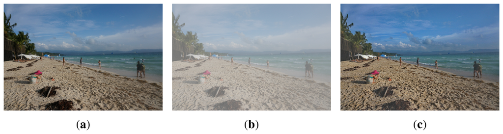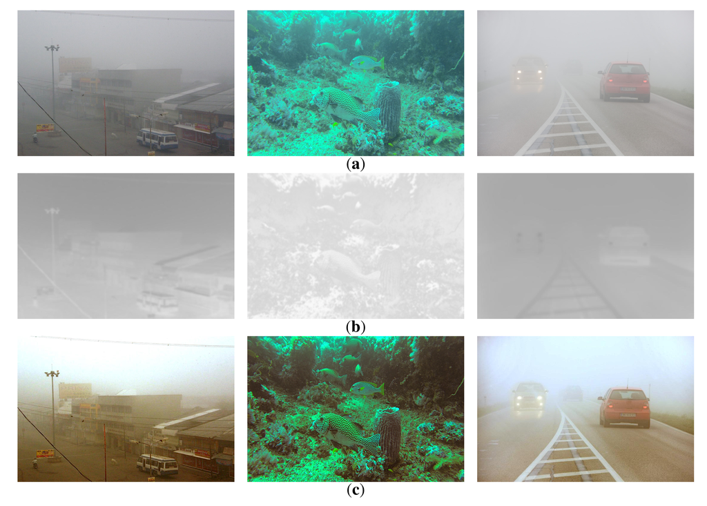 Figure 12a shows hazy images acquired by a video surveillance camera, an underwater camera and a vehicle black box camera. Figure 12b shows the modified transmission maps using the proposed method, and the results of the proposed dehazing method are shown in Figure 12c. Based on the experimental results, the proposed dehazing method can successfully restore the original color of the scene with a moderately hazy atmosphere, but its dehazing performance is limited with a severe amount of haze in the atmosphere.