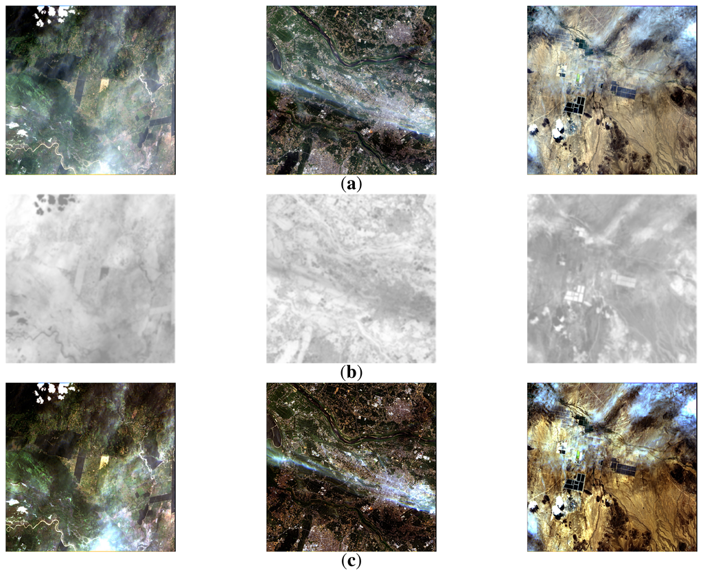 Figure 13a shows three satellite images acquired by the Korea Aerospace Research Institute (KARI). Figure 13b shows the modified transmission maps, and Figure 13c shows the dehazed results using the proposed method. Based on the experimental results, the proposed dehazing method can successfully restore the original color of the scene with a moderately hazy atmosphere, except with an excessive amount of haze, such as thick cloud.