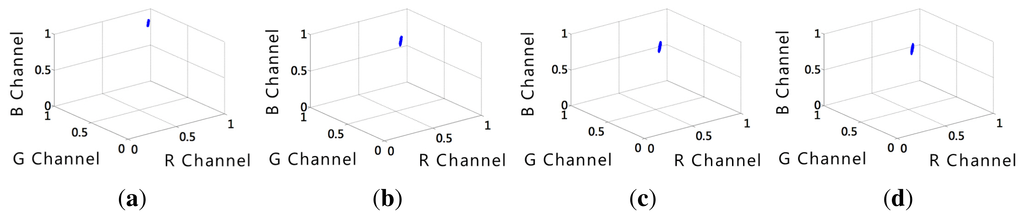 In Figure 1, the white region enclosed by the red rectangles contain the pure white color, and color distributions of the red rectangular regions in the four images were used. Theoretically, pure white regions, as shown in Figure 1a, have unity in all RGB color channels. However, the real values are not exactly the same as unity, but are close to unity because of noise. The color distribution appears as a “point” in the three-dimensional RGB space, as shown in Figure 2a. On the other hand, as the amount of haze increases in the atmosphere, the distribution becomes elongated ellipsoids, as shown in Figure 2b–d, since the turbidity of haze decreases the brightness of the object by scattering.