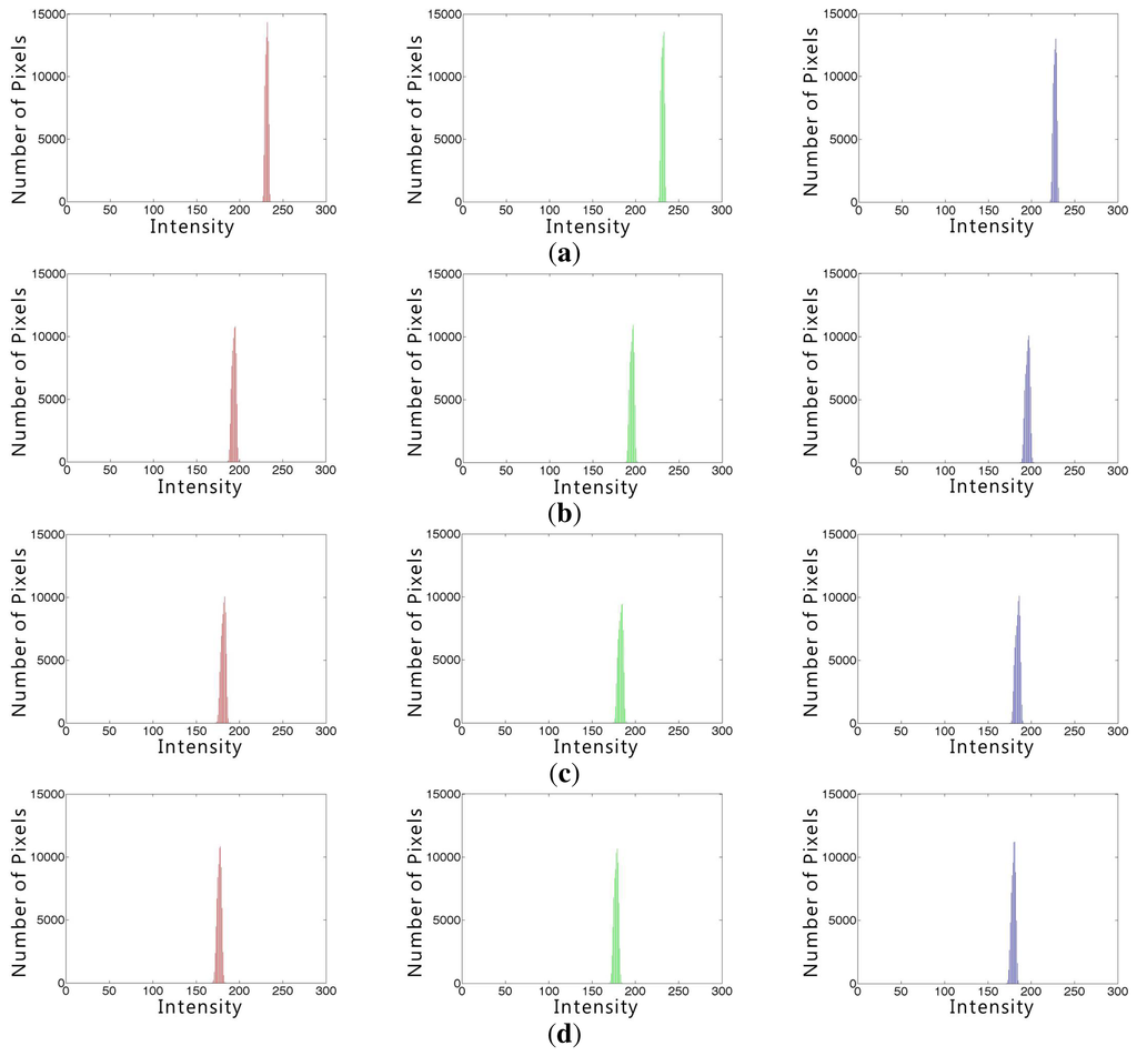 More specifically, Figure 3 shows RGB color histograms in four white regions enclosed by the red rectangle in Figure 1 and supports the observation in Figure 2.