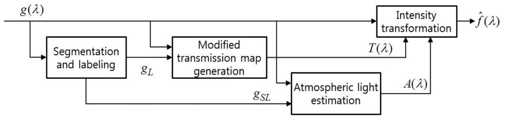 The proposed dehazing algorithm consists of image segmentation and labeling, modified transmission map generation, atmospheric light estimation and intensity transformation modules, as shown in Figure 5.