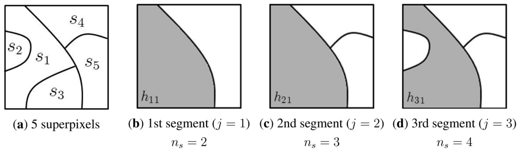 Figure 6a shows a sample input image decomposed into five superpixels, si, i = 1,…, 5. In order to assign one of three classes, such as υ ∈ {(S)ky, (V)ertical, (G)round}, to each si, we perform image segmentation multiple times using different hypotheses. For the first superpixel si, Figure 6b–d show regions containing s1 for the j-th hypothesis, such as hj1 for j = 1, 2, 3. Let bi and b̃ji ∈ {S, V, G} respectively represent labels of si and hji; then, the most suitable label for si maximizes the confidence value, defined as:
