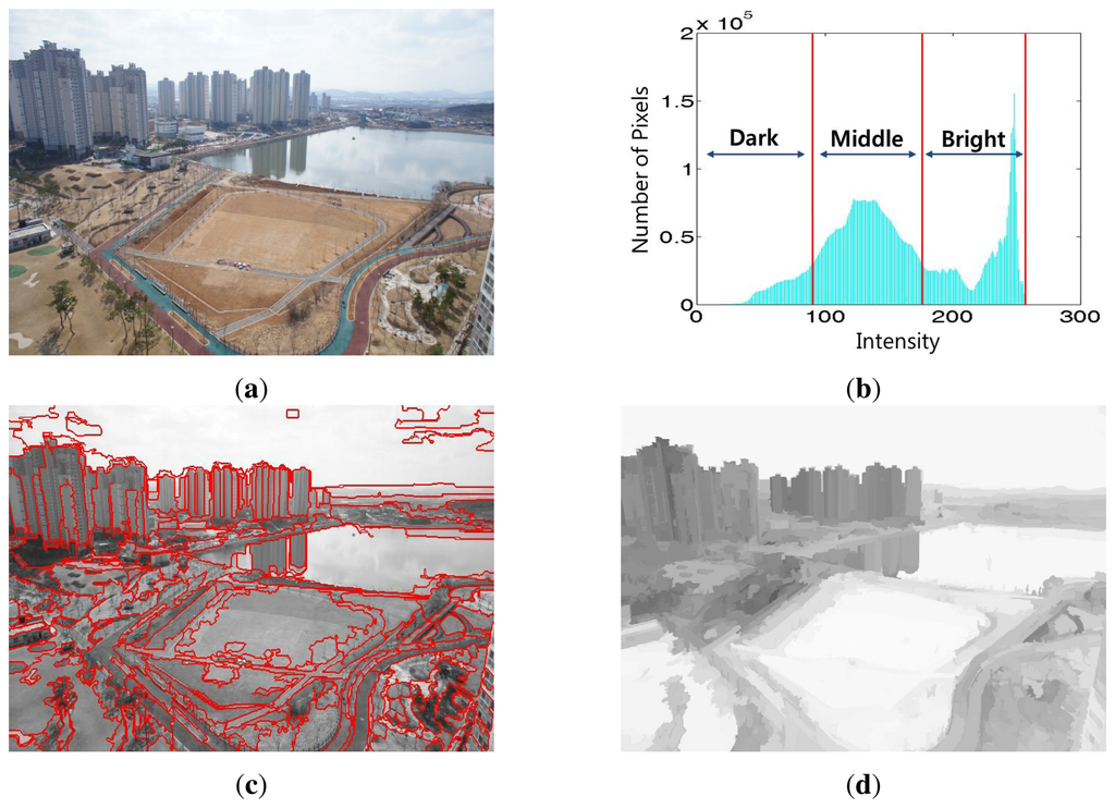 Figure 7a shows an input hazy image. Figure 7b shows three classified regions, dark, middle and bright, in the histogram of the input image, and Figure 7c shows the segmentation result using the proposed algorithm. We can obtain the labeled image gL using the same class of image as shown in Figure 7d.