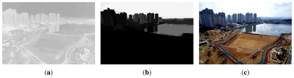 Figure 8a shows the proposed transmission map of Figure 7a. As a result, the proposed spatially-adaptive transmission map has continuous intensity values in the neighborhood of boundaries. Figure 8b shows the labeled sky image using the proposed segmentation method. Figure 8c shows the dehazed image using the modified transmission map in Figure 8a. As shown in Figure 8c, the proposed method significantly enhanced the contrast of the hazy image without color distortion or unnatural contrast amplification.