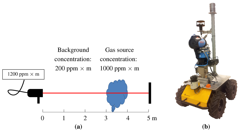 Mobile robotic olfaction is a recent research direction which aims at overcoming the problems of fixed sensor networks. It combines gas sensors, as used in the fixed networks, with the flexibility of a mobile platform [4]. Different platforms have been successfully tested in recent years for mapping the gas concentration and source localization, both in indoor and outdoor environments [5–7]. The use of mobile platforms has become even more appealing since the introduction of sensors which are capable of detecting gases remotely [8–10]. In particular, sensors based on tunable diode laser absorption spectroscopy (TDLAS) [11,12] allow for ranged sensing up to considerable distances (if the field of view is unobstructed), but are expensive and relatively bulky. Therefore, they are not suitable to be distributed in large numbers in the environment, but they can be used on-board a mobile platform.