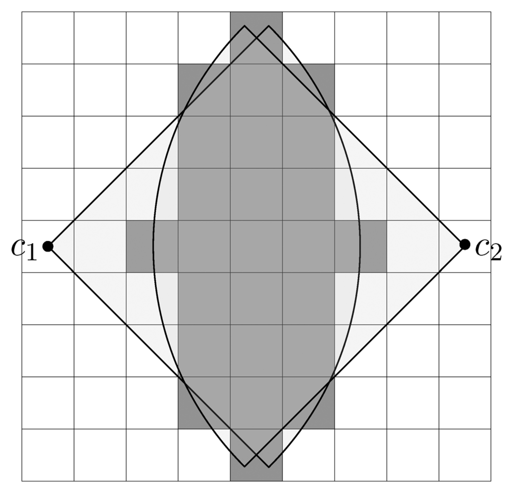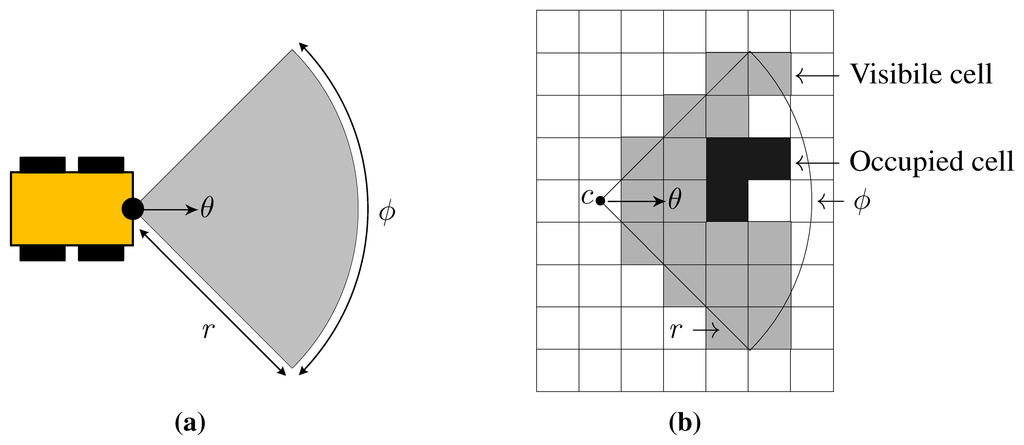 so that a cell k is considered visible to a sensing configuration ci if the line segment connecting the centers of ci and k is in the circular sector of ϕi and ri, and does not intersect any occupied cell, as shown in the example in Figure 3b.