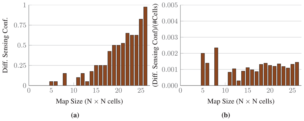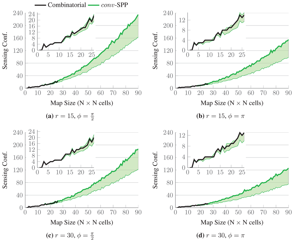 The results for a single map randomly chosen from each set are shown in Figure 11. The thick black lines represent the number of sensing configurations selected in the optimal solutions, while the upper bounds of the green-colored intervals represent the number of sensing configurations selected by conv-SPP. The lower bounds of the intervals represent the number of configurations after the first iteration of the ℓ1-minimization. The inset graphs show the results up to maps of size 26 × 26, for which the optimal solutions are available. conv-SPP obtains results which are very close to the optimal solutions in terms of the number of sensing configurations selected, as our method does not add more than two sensing configurations for any instance. Figure 12 shows the average difference of solution quality, which, for the available results, is always less than one sensing configuration.
