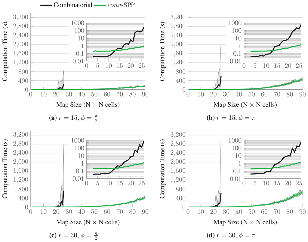 We evaluated conv-SPP on sets of randomly generated grid maps of varying size, from 3 × 3 to 90 × 90 cells. In each map, 10% of the cells are occupied by obstacles, and we assume that cells have an identical side length of 1 m. Each set is composed by 10 different maps of identical size, with the only exception of the set of maps of size 3×3, where, considering all symmetries, only 3 unique instances are possible.