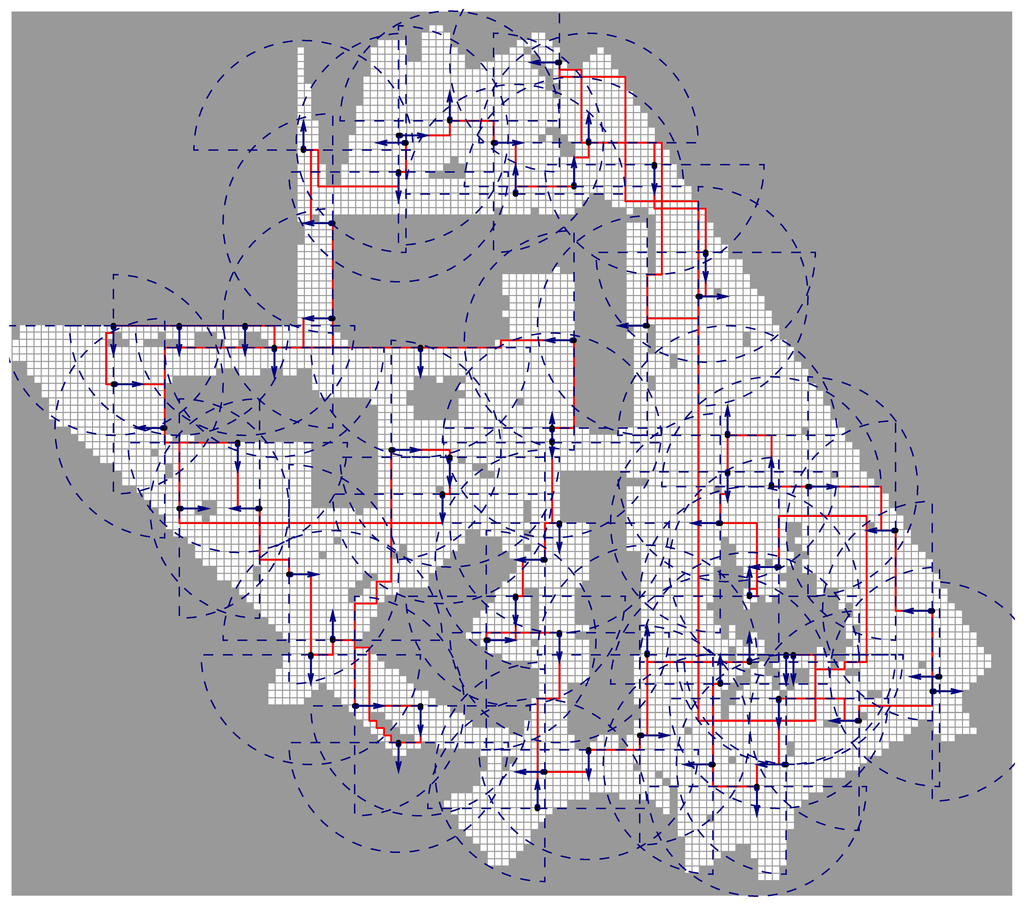 Intuitively, this approach should yield good results whenever the time required for sensing actions is significantly less than the one for movement. Figure 5c,d show an example of this two phase approach, where first a tour is calculated, such that it connects contiguous candidate sensing configurations from which the whole environment is observable (Figure 5c). Then, in the second phase, the algorithm selects the set of minimum cost candidate sensing configurations on the path necessary to observe the whole environment (Figure 5d). The robot will follow the tour as generated in the first phase, but will only stop for sensing according on those sensing configurations selected in the second phase.