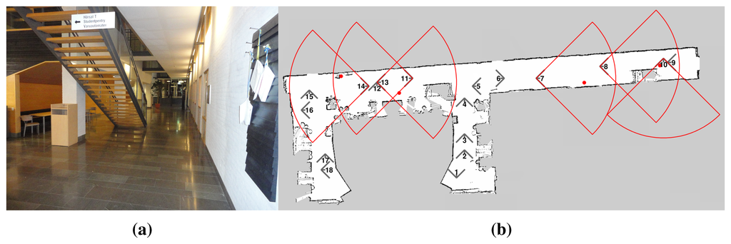 We also used the Freiburg University campus map [54] to demonstrate our algorithm on a real map. We discretized the map into a Cartesian grid where each cell covers 1 m2. The map size is 120 × 136 cells, 6113 of which are unoccupied (see Figure 14). For the sensing parameters , r = 15 m, and ϕ = π, our algorithm generated a solution of 68 sensing configurations in 90.87 s with a lower bound of 53.03 configurations. This scenario is evaluated in based on real map data (but without actual gas sources) to verify that our approach is able to efficiently cover a large real environment. In our ongoing work, we are performing actual gas detection tasks using the described algorithm on a robot in different environments (see Figure 15a for an example). Initial results are quite promising, as shown in Figure 15b. For more details on the experiments and the evaluation, we refer the reader to our forthcoming publication [52].