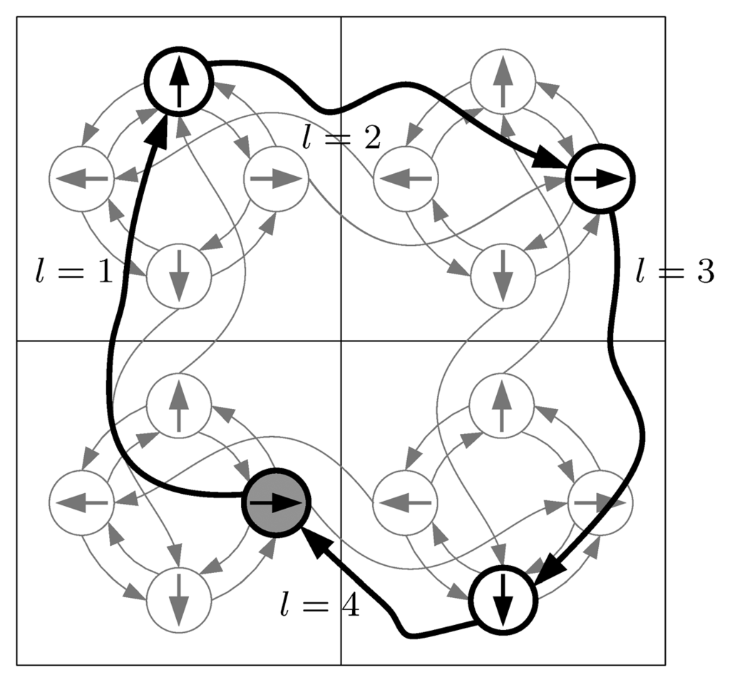 , where υci = 1 if configuration ci is the unique special vertex in a given solution, υci = 0 otherwise. An example of a solution π where the shortest paths between configurations are annotated with label variables is shown in Figure 4.