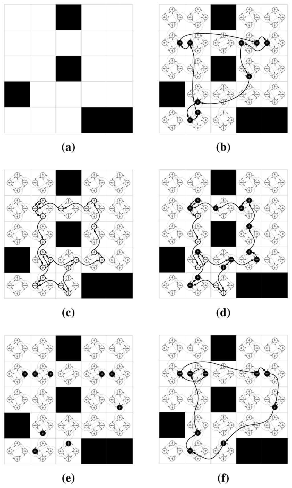 (ci) = ∅ (for instance, the ones placed in the cells at the border of the map; can be safely disregarded. Figure 5a is an example test map whose optimal solution is given in Figure 5b.
