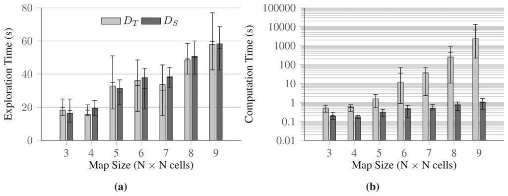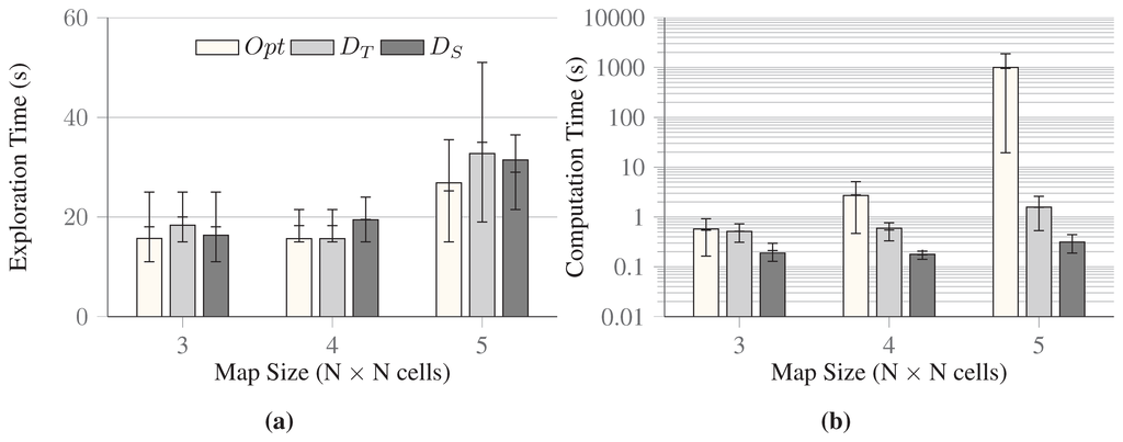 Figure 13 shows the aggregated computation times for both approaches: The thick lines represent the average computation times for each set of maps, while the colored intervals are bounded by the minimum and maximum times it took to solve all the instances in one set. The inset graphs show the computation times on a logarithmic scale: As it can be seen, the time required to calculate the optimal solution of the problem increases steeply with the size of the maps considered. It is worth noticing that the calculation of the optimal solutions for maps up to 13 × 13 cells takes less time than when conv-SPP is employed. This is because the number of variables is small and the combinatorial method can find a solution quickly. On the other hand, conv-SPP runs at least one iteration of convex relaxation and then performs combinatorial optimization for the remaining variables. Therefore, the iterations of convex relaxation simply require additional time. We stopped computing the optimal solutions for a set of maps whenever at least one instance of the set required more than one hour to be solved optimally. By contrast, our method could solve all the instances in less than 800 s.