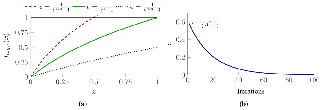 In our implementation we adapt the value of ϵ in each step i according to Equation (8), so that it sets relatively high value at beginning to avoid a local minimum in early iterations to explore globally better solution, and then deceases to exponential decay with each iteration to speed up the convergence (see Figure 9b).