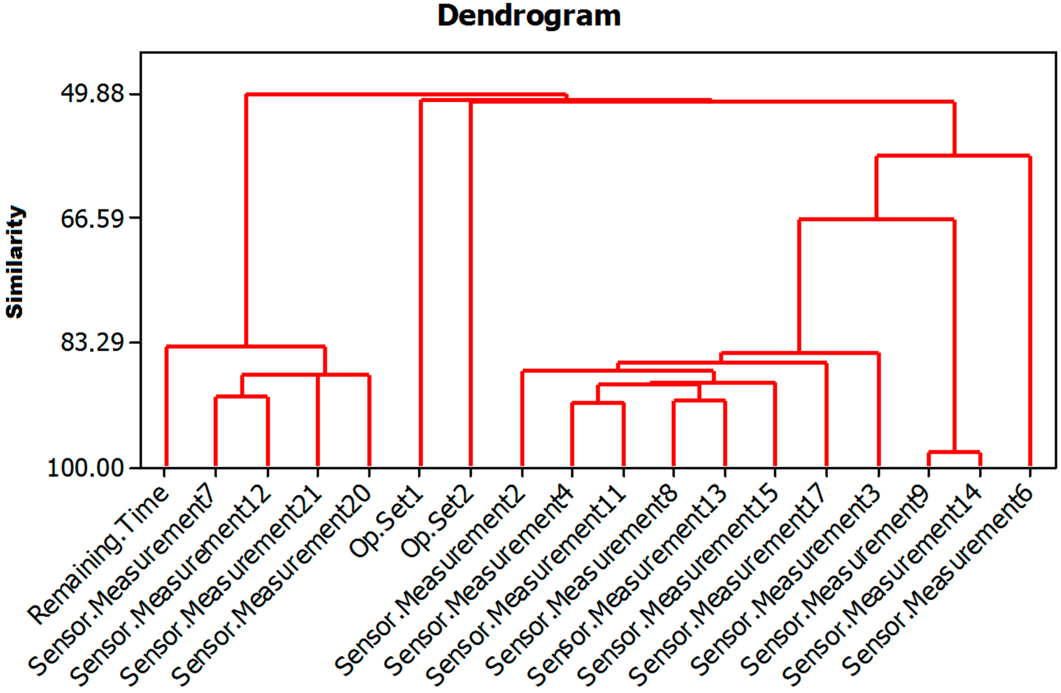 - Study of selected variables similarity by means of a dendrogram: The remaining variables were classified by means of a dendrogram in order to find those which are most similar to the output variable, which in this case is the remaining useful life.