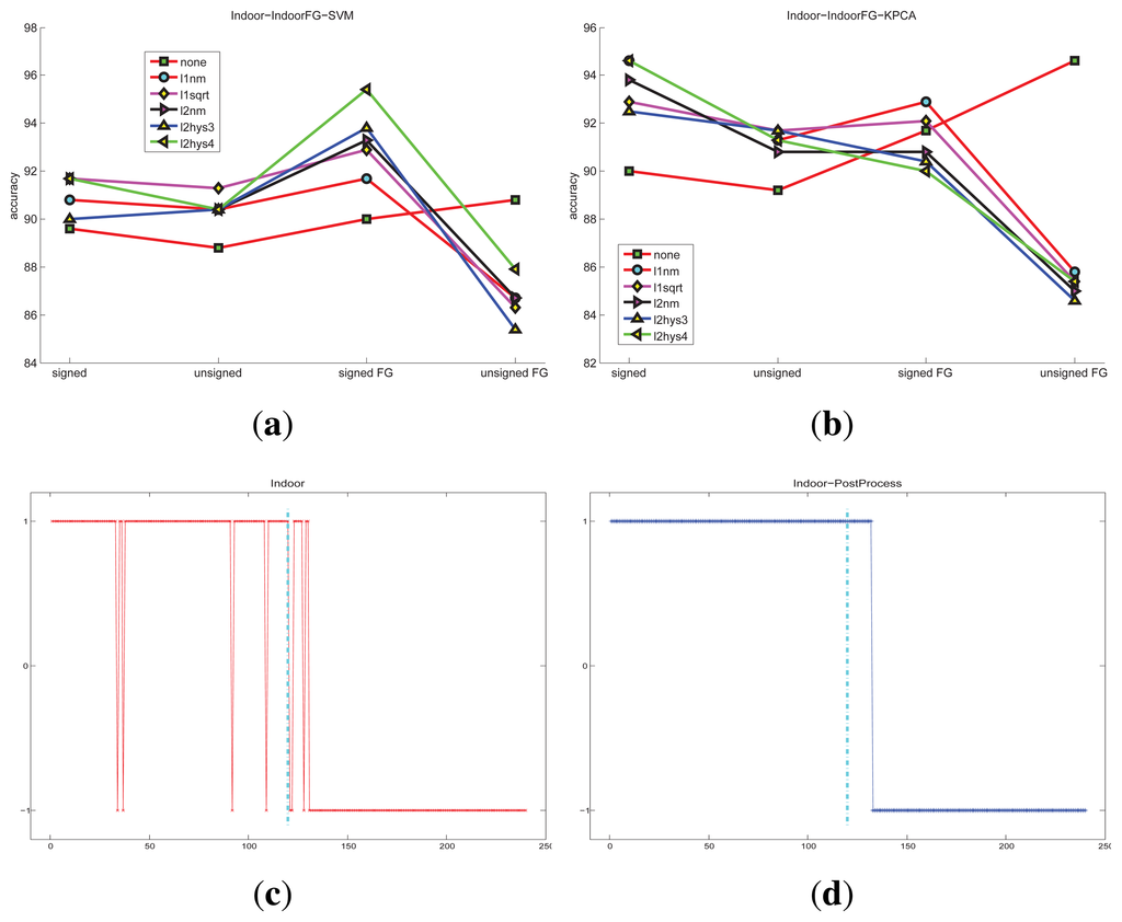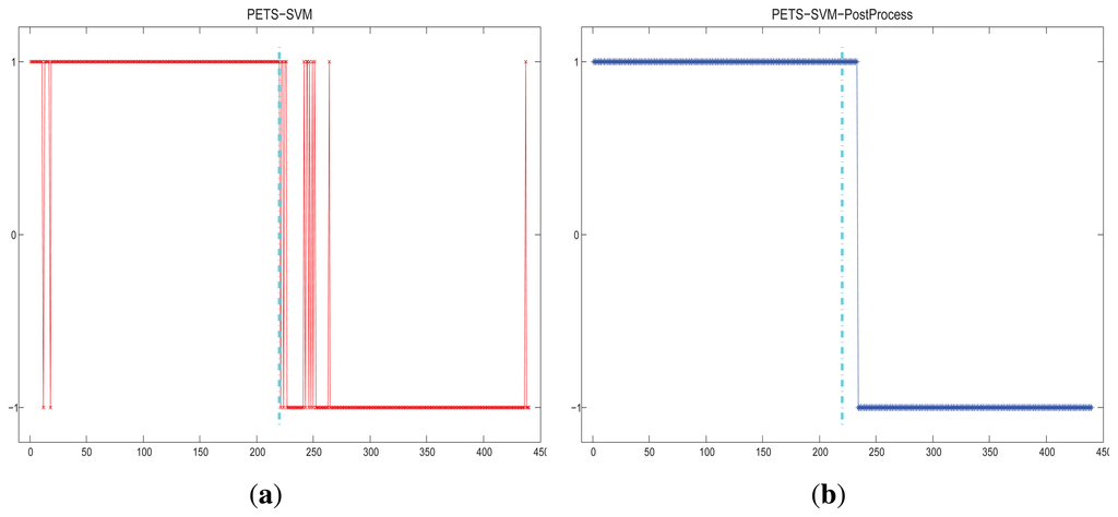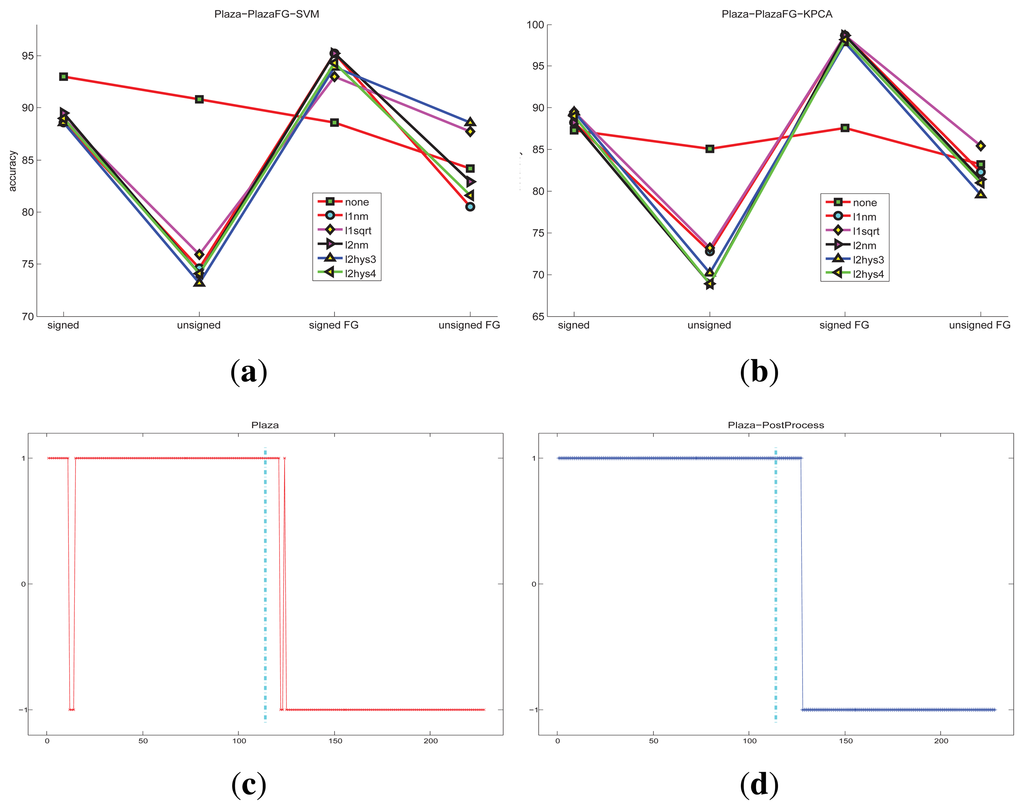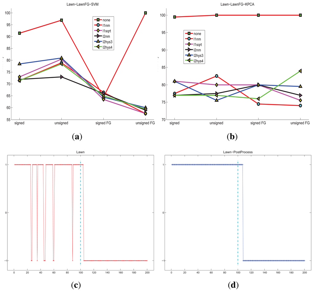 For the lawn scene, the detection accuracies of different conditions are shown in Figure 9. One-class SVM and KPCA classification methods can get great accuracy without the state transition restriction strategy.