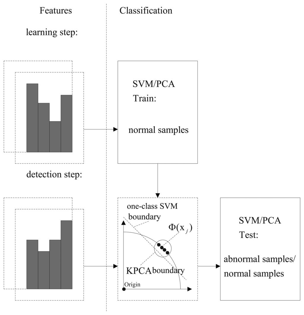 The one-class support vector machine or kernel principal component analysis method is used to classify feature samples of the incoming video frames. The flowchart of our method is shown in Figure 3.