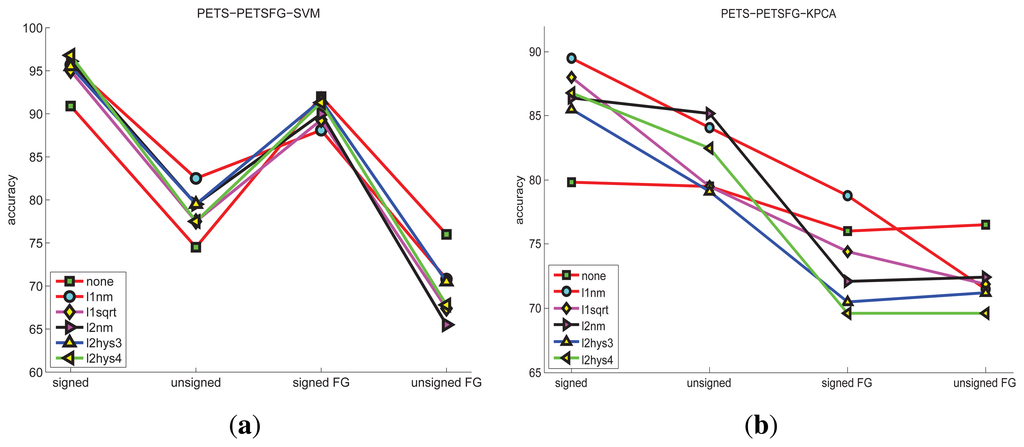 The detection accuracies of PETS dataset under different features and classification methods are shown in Figure 4. The HOFO features are obtained under different conditions, which include original image, foreground image, signed angle, unsigned angle, L1-norm, L1-sqrt, L2-norm, L2hys-0.3, L2hys-0.4 and none normalization. The KPCA novelty detection method obtains less accuracy than the one-class SVM. The best accuracy of the KPCA results is 89.5% under the condition of the original image, signed angle and L1-norm normalization. The best accuracy of the one-class SVM is 96.8% under the condition of the original image, singed angle and L2hys-0.4 normalization. Examples of this high dimension feature space are illustrated in Figure 5 by using the projection of the three largest principal components. The training normal data (labeled as a blue cross) are confused with the testing normal data (labeled as a cyan diamond) and the testing abnormal data (labeled as a red rectangle). In a word, the training data are mixed with the test-abnormal data. One-class SVM has a slack variable, which tunes the number of acceptable outliers of the training data. This soft margin strategy makes the one-class SVM obtain more precision.