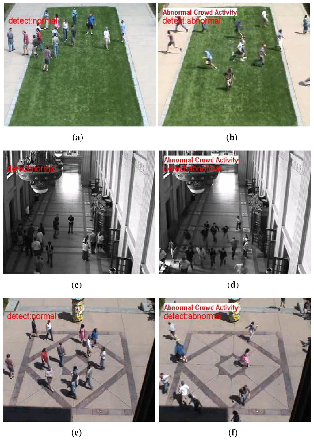 The HOFO descriptor can represent not only the information of optical flow orientation, but also the optical flow magnitude. The results of the benchmark dataset UMN are shown in Figure 8. The HOFO descriptor can deal with the abnormal scene in which people are running in all directions.