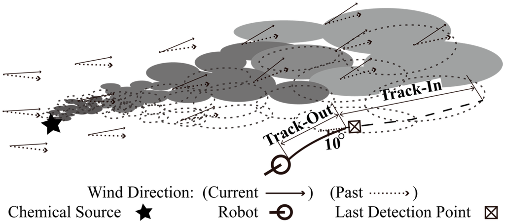 The Track-Out activity comprises two successive processes: (1) rotating: At the beginning of the Track-Out activity, the robot rotates to align its heading with the biased upwind direction; (2) sprinting: The robot moves along the biased upwind direction. On one hand, a big acute bias angle along the right direction is often needed for directing the robot towards the lost plume. On the other hand, most real mobile robots (e.g., fin-controlled underwater robots [], various terrestrial [,] or flying [,,] robots) require longer time to rotate a bigger bias angle. To minimize total time spent in the Track-Out activity, a bargain between the time spent in rotating and sprinting can be stricken by properly determining the bias angle. However, the bias angle used in BUS [] is optimized beforehand for all possible Track-Out activities using offline Monte-Carlo simulations. The offline optimized bias angle would not be optimal when it is used in real environments with airflow field different from the simulated ones. The problem of determining the bias angle to adapt different real airflow fields needs further investigations.